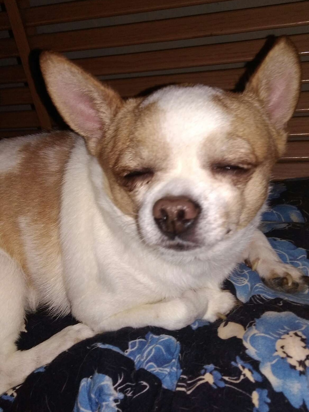 我家狗的品种是吉娃娃,男孩,叫小白。小白可听话了,吃饱喝足了就知道干活,一天24小时为我们看门。但是他今天晚上太累了,情不自禁睡着了。