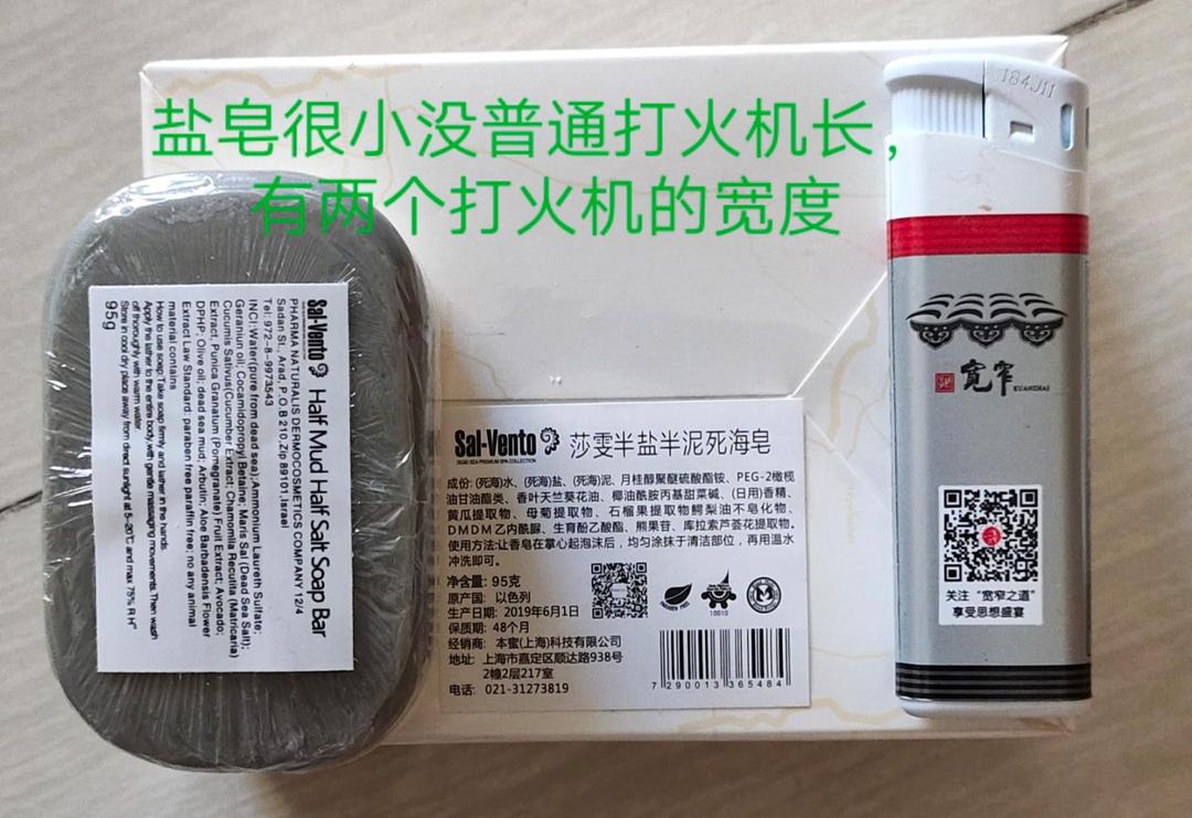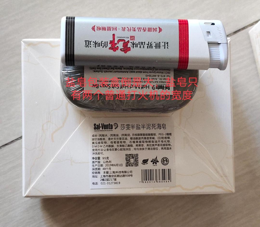 收到的实物盒子挺大里面的盐皂很迷你是盒子的13的大小差不多吧,拍了一些图片放了打火机一起拍有个对比,也能知道盐皂的大概大小,不知道东西好不好用,等用了才能知道,只可惜只能评价一次没办法等用后在追评评价