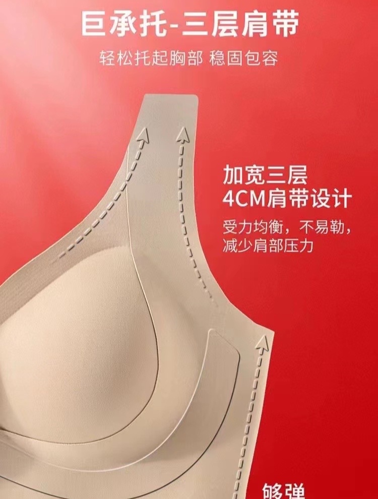 巨包容——罩杯 再大,也能无痕包容你 巨承托——肩部 轻松托起胸部 稳固包容 巨无痕——面料+结构 随意裁面料,打破舒适边界