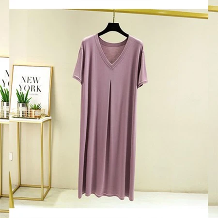 砾驾莫代尔连衣裙夏季休闲家居睡裙大码宽松大摆长裙·AWLS-6678V领长裙浅紫