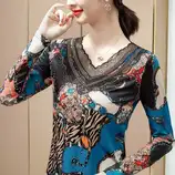 兰心格波浪领烫钻印花打底衫·小波浪领蓝色 13773#