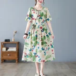 絮笈复古盘扣碎花棉麻收腰系带连衣裙·花色5